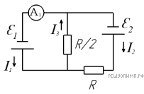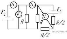 Версия для печати и копирования в MS WordДля электрической цепи (см. рис.) определить показания приборов (считать идеальными) если E1 = 60 В, E2 = 30 В, R = 5 Ом. Внутренним сопротивлением источников пренебречь.