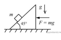 Клин действует на брусок с силой, равной по величине и направленной перпендикулярно наклонной грани клина влево-вверх. Вертикальная компонента этой силы равна mg и уравновешивает действующую на брусок силу тяжести. Горизонтальная же компонента, также равная mg, сообщает бруску ускорение, равное по величине g и направленное влево.