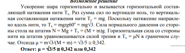 Версия для печати и копирования в MS WordШар массы m = 100 г привязан нитью к штативу массы M = 400 г и вращается вокруг вертикальной оси так, что нить образует угол 60° с вертикалью. При каком наименьшем коэффициенте трения между столом и штативом, штатив останется в равновесии?